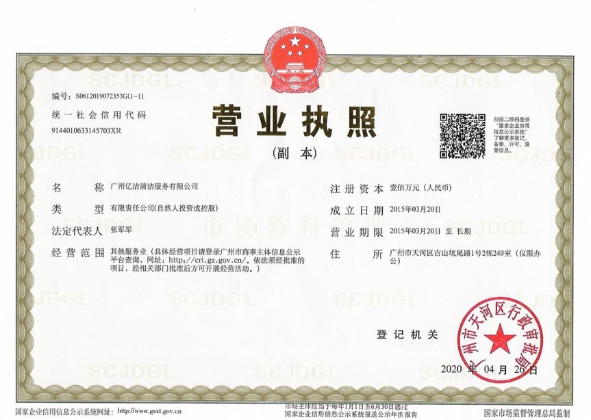 廣州億潔清潔服務(wù)有限公司是經(jīng)廣州市工商行政管理局批準(zhǔn)成立的(注冊(cè)資本:100萬(wàn)元人民幣)。具有獨(dú)立法人資質(zhì)。公司成立2015年,公司具備完善的管理體系和高素質(zhì)管理隊(duì)伍,擁有特種技術(shù)人員33名,保潔服務(wù)人員上萬(wàn)名,覆蓋廣州市,能及時(shí)調(diào)配并快速投入高效運(yùn)行。我們的每個(gè)員工都經(jīng)過(guò)公司的嚴(yán)格篩選,嚴(yán)格培訓(xùn),定期培訓(xùn)后持證上崗以保證服務(wù)品質(zhì),保障客戶的權(quán)利,利益,形象等不受損失。 廣州億潔清潔公司是一家設(shè)備齊全,技術(shù)強(qiáng)大的綜合型清潔服務(wù)公司,為客戶提供完善服務(wù)尊定了堅(jiān)定的基礎(chǔ)。 司于2010年全面推行了ISO9001質(zhì)量管理體系認(rèn)證和ISO14001國(guó)際環(huán)保體系認(rèn)證。先后獲得廣州高層建筑外墻清洗維修作業(yè)【安全資質(zhì)證書】、【廣州環(huán)衛(wèi)企業(yè)等級(jí)證書C級(jí)資質(zhì)】、廣州疾控中心頒發(fā)的【四害消殺服務(wù)資質(zhì)證】、【空氣治理A級(jí)資質(zhì)】、中國(guó)石材協(xié)會(huì)頒發(fā)的【石材資質(zhì)B級(jí)資質(zhì)】等。 廣州億潔清潔服務(wù)有限公司致力于打造專業(yè)、實(shí)惠、靠譜的保潔服務(wù)公司,把專業(yè)的事情交給專業(yè)的我們,您放心! 億潔清潔服務(wù)項(xiàng)目: 廣州保潔服務(wù):新建樓宇、別墅、酒店、醫(yī)院、辦公樓、賓館、企事業(yè)單位廠房竣工后開荒及裝修后精細(xì)保潔.工程保潔服務(wù)。 廣州物業(yè)托管:為廣州市各大企事業(yè)單位、賓館、政府機(jī)關(guān)、小區(qū)物業(yè)、酒店及廠房提供專業(yè)化保潔、園林、設(shè)施維護(hù)等管理服務(wù)。 廣州高空作業(yè):高空玻璃幕...[詳情]